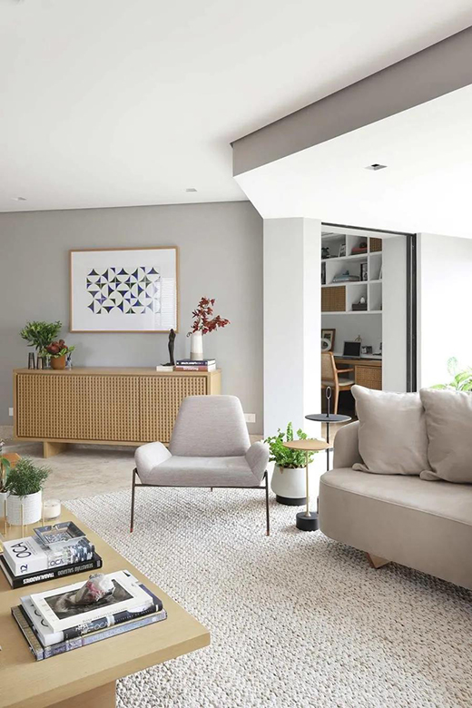 另一頭連著的,是和客廳到打通的陽臺,并且陽臺的一側(cè)又連著家里的共享書房,所以整個空間的互動非常強(qiáng)。
