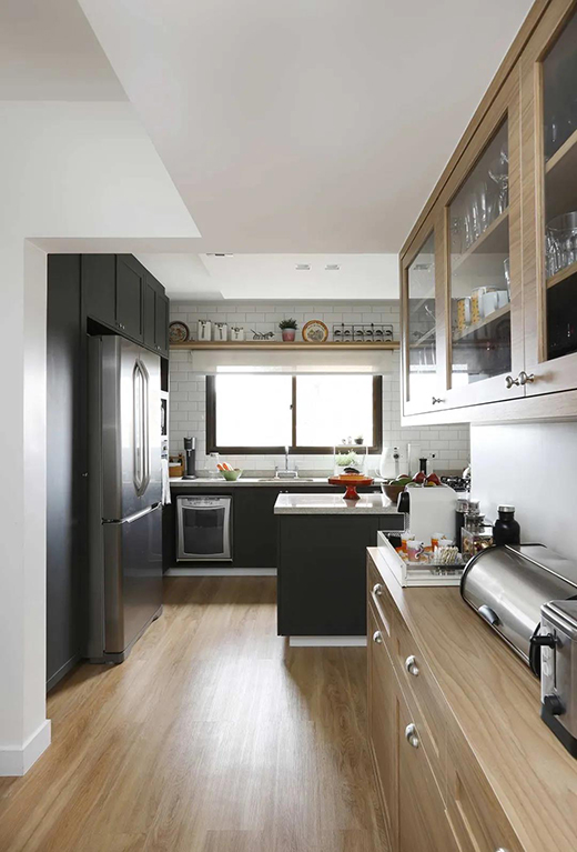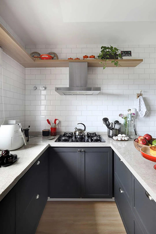 考慮到儲物空間也足夠了,這家人最后選擇舍棄傳統(tǒng)吊柜,而是以一排L型長擱板代替,做簡單的置物收納。