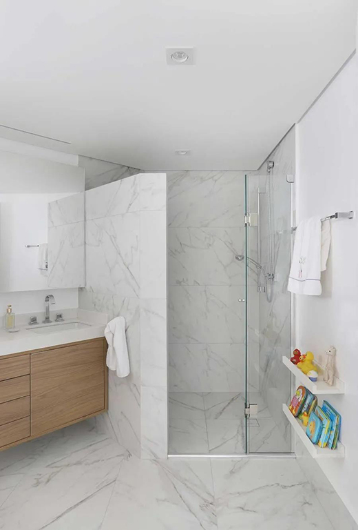這間獨(dú)衛(wèi)也是搭配給孩子單獨(dú)使用的,靠近地面的墻上設(shè)計了隔板,用來放置小孩洗澡時喜歡的玩具。