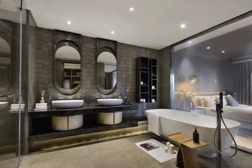 衛(wèi)生間可以通過調節(jié)主燈與周邊射燈切換氛圍。有的人喜歡更亮,有的人也許喜歡暗一點,讓衛(wèi)生間看起來也高級感十足!