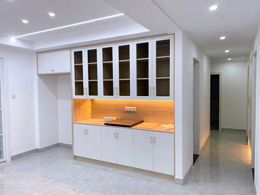 餐廳設(shè)計(jì)了上下兩層的餐邊柜,預(yù)留了位置可以放冰箱,大小位置合適,不需要把冰箱放在廚房,可免受油煙污染,使用的時(shí)候沒(méi)有任何影響,給人一種非常有設(shè)計(jì)感。餐邊柜中間留空位置,安裝了燈,可以起到一定的氛圍作用,還可以增加二次照明,真心不錯(cuò),看著都很有檔次。柜子都是全屋定制的,質(zhì)量與做工都比較滿(mǎn)意,讓人喜歡。無(wú)主燈的設(shè)計(jì),顯得很簡(jiǎn)潔,時(shí)尚,晚上足夠把各個(gè)空間照亮起來(lái)。