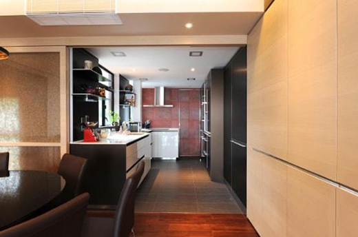 深褐色的玻璃柜門與燈帶的搭配,營造出個性不凡的廚房設計,簡約的吊頂與筒燈和隱藏式的燈帶,讓空間通透明亮,造型美觀,但不失美的氣質。