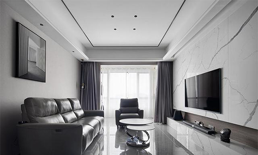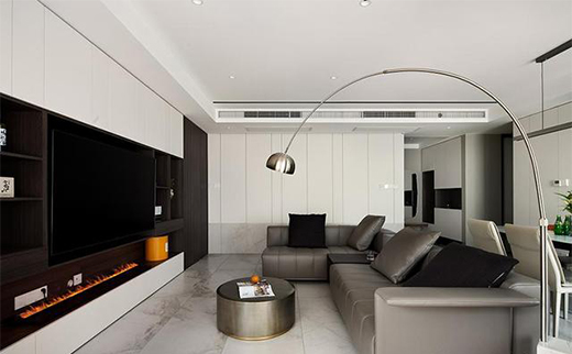 客廳空間以灰、黑、白三色為主,用一抹靈動的金屬色搭配光源充足的燈光設(shè)計,共構(gòu)一處敞朗而明亮的空間。