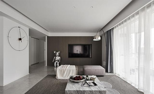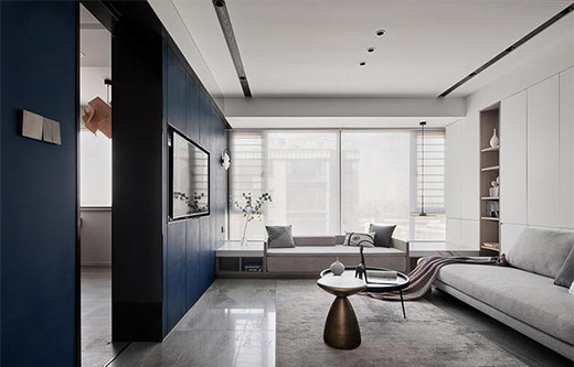 此戶型空間層高很高而梁過低,所以頂部采用無主燈設(shè)計,運用大面積吊平頂?shù)氖址ㄈト趸謱捰值偷拇罅?,黑色線條貫通南北,簡約通透的格局規(guī)劃中將藝術(shù)滲透進生活里。