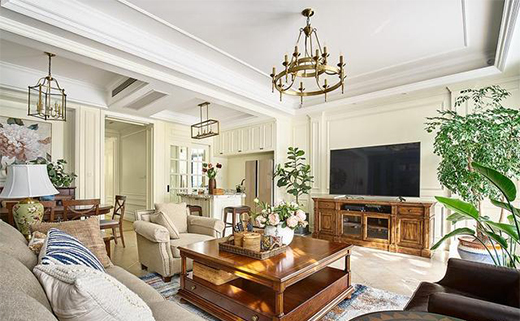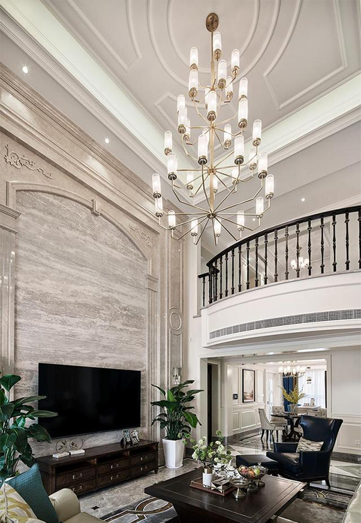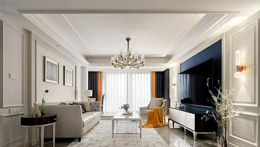 以亮麗的灰白為主色調(diào),視覺上更開闊、通透,選擇輕奢大氣的美式吊燈加上同款壁燈,令客廳空間更顯層次,墻面造型立體美觀。