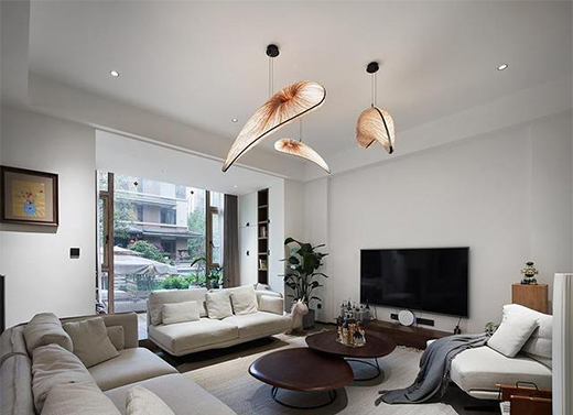 木質(zhì)家具沉靜溫和、協(xié)調(diào)舒適,搭配日式月亮吊燈讓空間更顯溫柔恬靜。