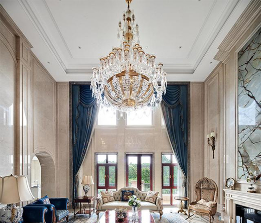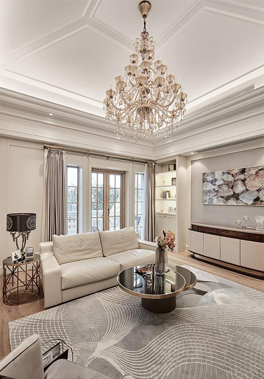 繁復精致的黃銅水晶吊燈與經(jīng)典歐式墻壁鑲邊,展現(xiàn)引人駐足的奢華布局手法,而置身其中的典雅大氣的家具,更凸顯空間的新古典韻味。