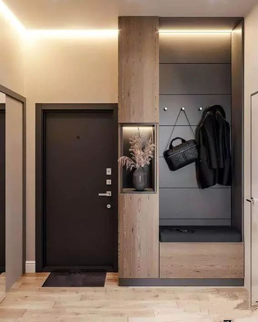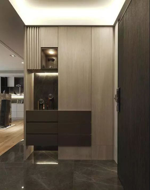 主燈照明弱只有一個頂燈,因為剛進門要找鑰匙,脫鞋,或者找東西,那么頂燈光會被身體的部分擋住很多,這是特別不方便的。我們可以在頂面設(shè)計成嵌入式的光源,增加柜內(nèi)燈的數(shù)量或者鏡面等,滿足玄關(guān)的無死角照明。