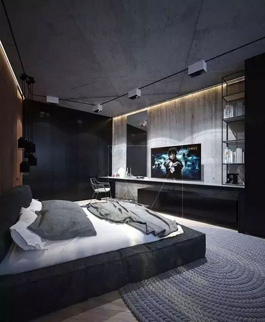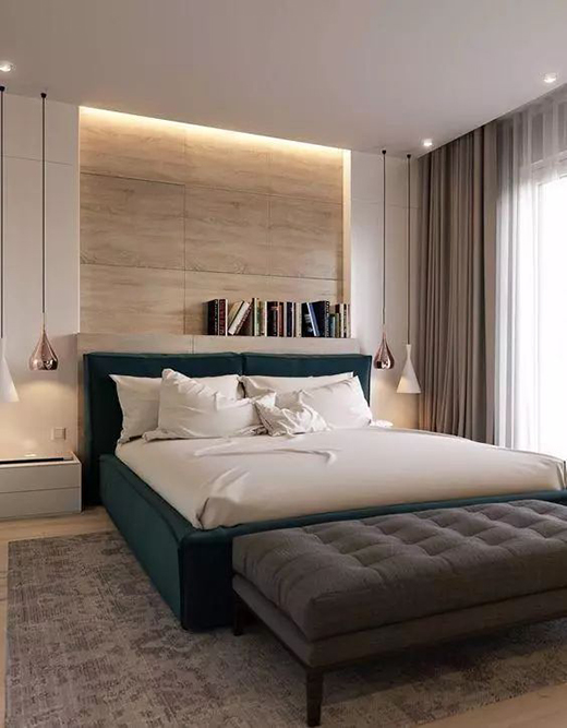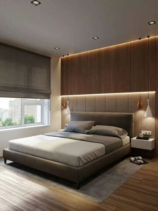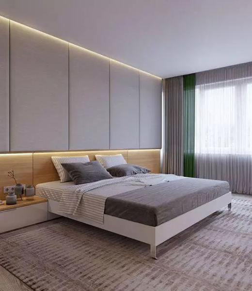 A. 分散在臥室的天花板安置燈帶,以及床尾部分安裝射燈,整體的照明,不至于刺眼。