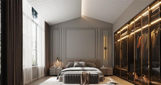 主臥室設(shè)計師利用原頂面的鞋面造型,結(jié)合做出人字形造型頂,內(nèi)側(cè)還增加了線型燈,滿足了無主燈的空間設(shè)計,利用米灰色主調(diào)做墻面結(jié)合石膏線,精致感十足,床體左側(cè)是半高窗臺,采光性十足,右側(cè)是長長的玻璃式衣柜,墨色設(shè)計更為空間凸顯設(shè)計感。