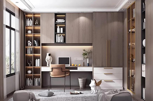 1.書房是閱讀、工作、學(xué)習(xí)的場(chǎng)所,因此要保留自然光源,又要設(shè)置燈具照明,還要注意保護(hù)視力,讓使用者有一個(gè)舒適、明亮的空間,享受幽靜的閑適感