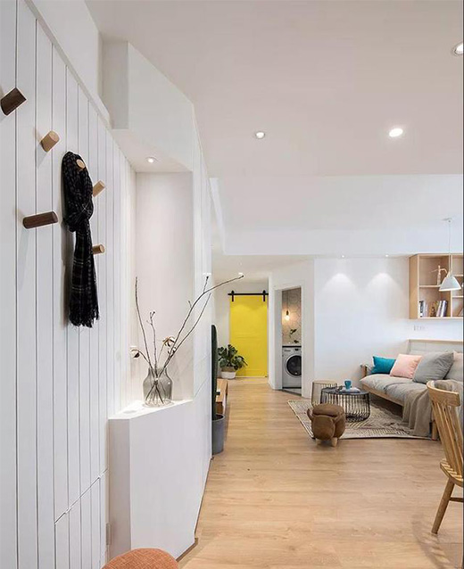入戶走廊區(qū)側邊墻面,打造格柵護墻板,圓柱掛鉤裝點,美觀實用的同時隱藏強電箱,同時以整面大柜子,邊緣貼合做不規(guī)則置物區(qū),增加視覺立體感,自然過渡。