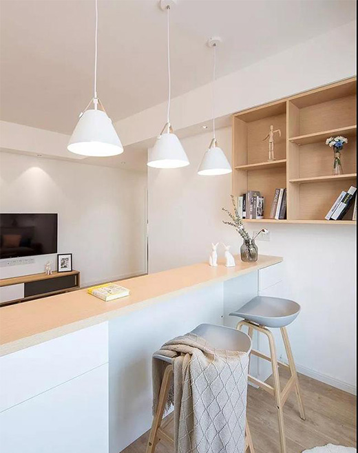 不同的是沙發(fā)后方打造原木色矮墻吧臺,白色吊頂,側邊開放實木書柜,整體通透和諧,平時也可在此看電視,同時也能當作書桌使用。
