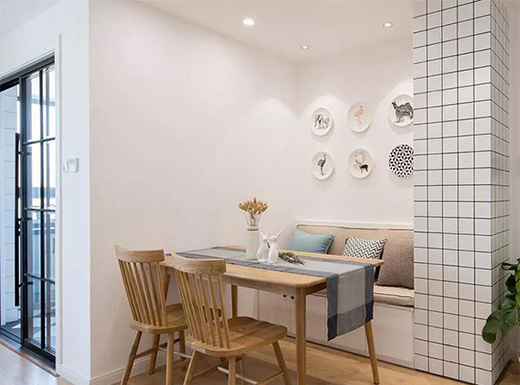 沙發(fā)一側借用墻柱打造卡座餐桌,潔白墻面以動物圖案盤子做裝飾,生動有趣,原木餐桌椅,頂部射燈映射下倍感溫暖解壓。