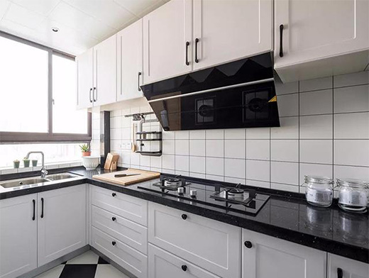 廚房以玻璃推拉門隔斷,白色方塊瓷磚上墻,干凈敞亮,黑白經典拼色地磚,簡單時尚的立體感,流暢操作動線,烹飪也有好心情。