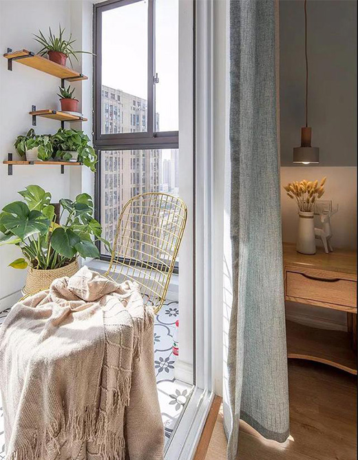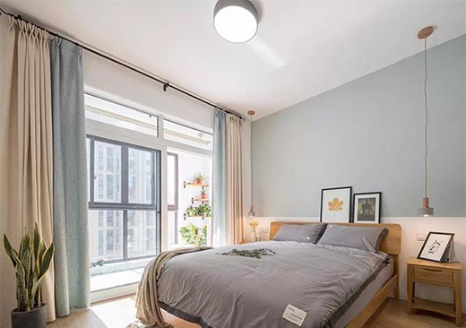 主臥淡藍色半墻拼接,呼應布藝遮光窗簾,和諧統(tǒng)一,實木床體搭配兩側小巧床頭柜+線狀吊燈平添一份文藝安靜的休息氛圍。同時改造陽臺位置地面花磚,鏤空金色背椅,墻面懸掛實木隔板擺放綠植,沐浴陽光閑坐放松,舒適安心。