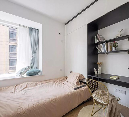依窗打造榻榻米書桌儲納柜一體,中間留空做書架,減少沉悶感,平時也可用作客房方便客人留宿。