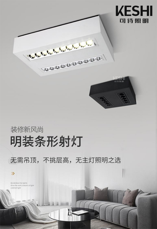 比如KESHI可詩照明新上架的明裝條形射燈,采用的就是明裝法,其在安裝后,我們?nèi)庋蹚牟煌慕嵌榷际强梢钥吹玫剿臒艟咄庥^的。也由于其顯露在外,這就要求燈具的外觀品質(zhì)及顏值要達(dá)到更高的水平,像可詩的這款產(chǎn)品外觀顏色有黑、白兩種經(jīng)典色可選,無論安裝于哪種裝修風(fēng)格的家中都是較為適宜的。而在品質(zhì)上,該產(chǎn)品也是采用最優(yōu)的材質(zhì)及驅(qū)動、芯片,稱得上是“經(jīng)久耐用”。