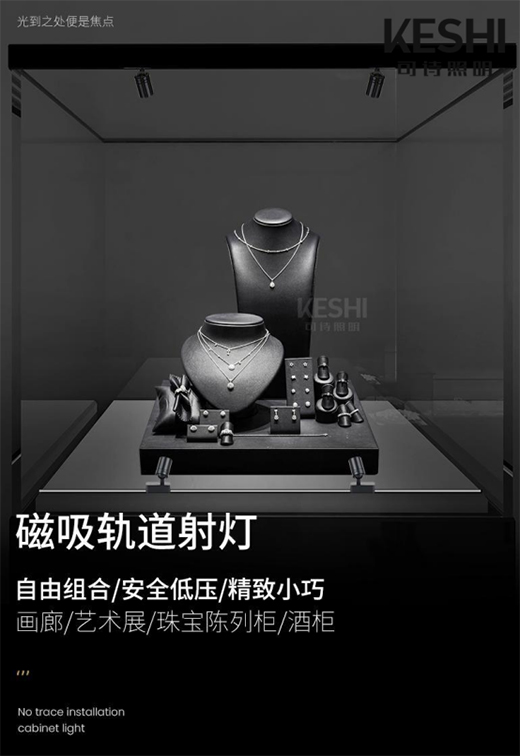 利用磁吸技術(shù)安裝的射燈產(chǎn)品,被命名為磁吸軌道射燈。磁吸軌道射燈有常規(guī)款與迷你款兩種,分別適用于不同的區(qū)域;像我們?nèi)粘<揖哟蟓h(huán)境中所看到的,便是常規(guī)款;而像是酒柜、衣柜、展示柜里的磁吸軌道射燈,便屬于迷你款。