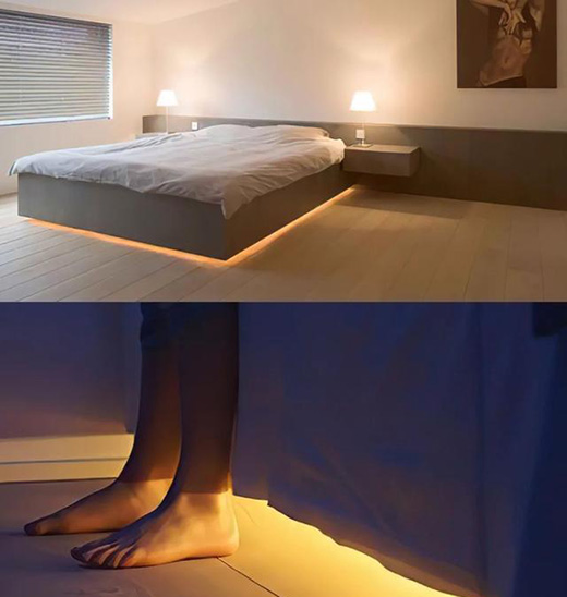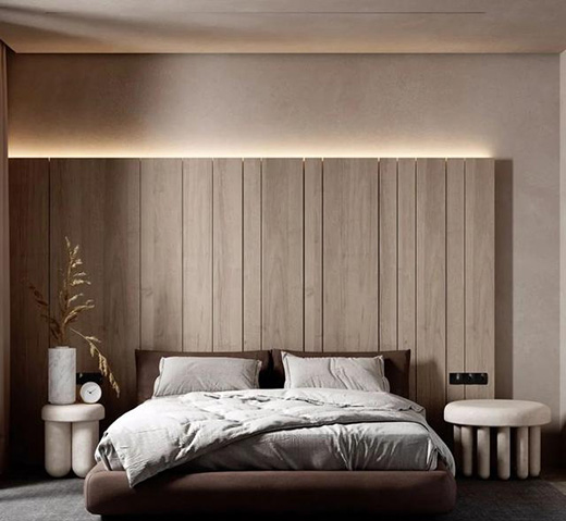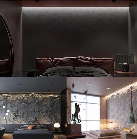 床頭不裝射燈,還可以用燈帶來做間接照明,一方面能夠起到裝點(diǎn)的作用,另一方面也能夠滿足日常的功能性照明,燈帶可以為臥室提供很好的氛圍感,對于一些大面積使用肌理造型的墻面來講,這種照明方式可以突出肌理層次感,防眩效果也是非常好的。間接光不僅可以安裝在天花上,還可以在墻面使用,比方說在床靠背后設(shè)置往上照射的燈帶,可以產(chǎn)生豐富的光源層次。除了床頭照明,燈帶還可以作為起夜燈,在床下設(shè)置一盞超低照度和色溫的感應(yīng)燈帶,方便起夜使用。