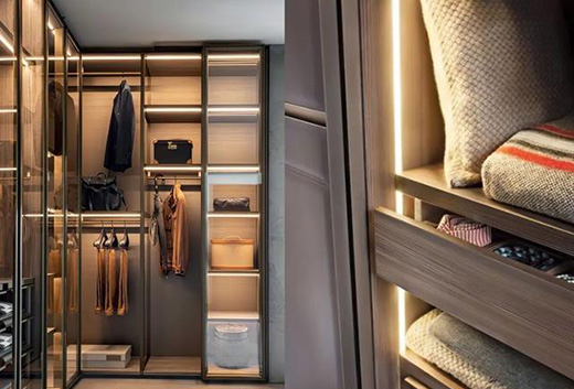 衣柜部分的照明也是我們重點(diǎn)關(guān)注的部分,主要分為內(nèi)外兩個(gè)部分,在衣柜外面安裝射燈,能夠保證柜門打開以后,可以無死角去觀察衣柜內(nèi)的物品,不過很多時(shí)候,為了看得更加清晰,我們都會(huì)建議在柜體的內(nèi)部裝上感應(yīng)燈帶,就像冰箱一樣,柜門打開自動(dòng)亮光,柜門合上自動(dòng)關(guān)閉,這樣在選擇和整理衣物時(shí)更加的方便。