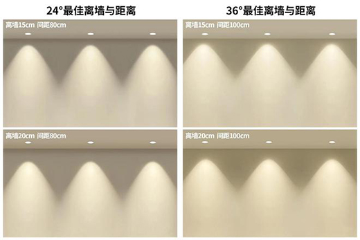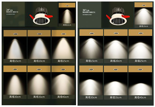 目前洗墻推薦使用“光束角”以24°和36°為主,這兩種角度,光的寬度和長度有區(qū)別,決定了山丘呈現(xiàn)的飽和度,主要是以中心光強(qiáng)的均勻與聚焦來分辨。24°中心光明亮,凸顯空間,能清晰的形成小山丘,多數(shù)用于茶幾,餐桌等重點(diǎn)照明,深受設(shè)計(jì)師們青睞。36°中心光柔和,大光弧,照射范圍廣,洗墻效果美如畫,多數(shù)用于背景墻、走廊、玄關(guān)等,是無主燈設(shè)計(jì)中的百搭王。