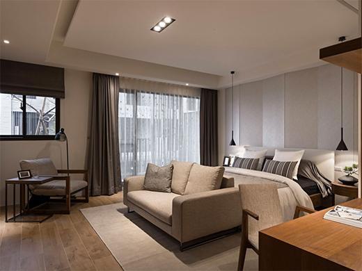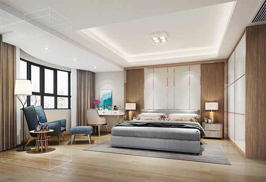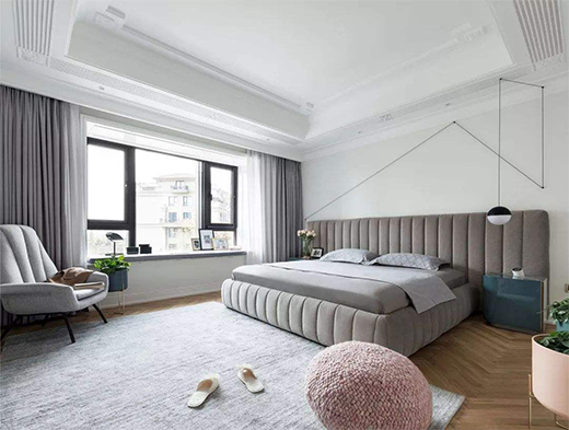 對(duì)于層高比較充足的臥室,可以臥室做上吊頂,然后暗裝上筒燈,讓空間照明更加均勻舒適,而且空間視覺(jué)感也會(huì)更加簡(jiǎn)潔大方。