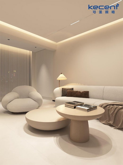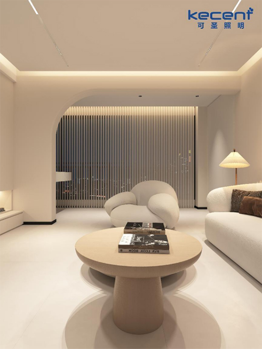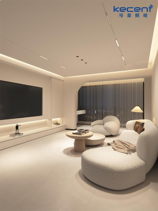 這里提個(gè)題外話,市面上銷售的大部分磁吸軌道燈的外觀顏色都為黑色,這與這個(gè)方案中整體偏向米色系的家居風(fēng)格明顯不符,若強(qiáng)行應(yīng)用上黑色的磁吸軌道燈未免過(guò)于突兀。但恰巧的是,KECENT可圣照明正有售賣外觀為白色的磁吸軌道燈,產(chǎn)品顏色能很好地與這個(gè)案例的空間色彩相融合,成功達(dá)到業(yè)主的高審美要求。
