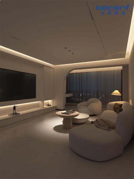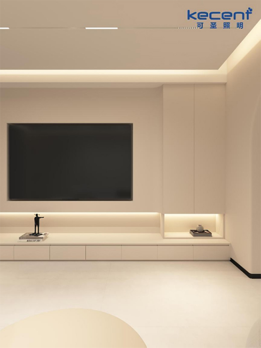 KECENT可圣照明燈光設(shè)計(jì)團(tuán)隊(duì)在處理這個(gè)方案時(shí),非常謹(jǐn)慎地將業(yè)主的實(shí)際需求及生活日常習(xí)慣放在首要考慮位置。在斟酌客廳燈光設(shè)計(jì)時(shí),考慮到業(yè)主有收藏藝術(shù)品擺件的興趣愛(ài)好,于是給電視柜做了巧妙的燈光氛圍處理,特意安裝上線條燈點(diǎn)亮這個(gè)小區(qū)域,趕走昏暗與壓抑,讓這里一躍成為藝術(shù)收藏品展區(qū)。