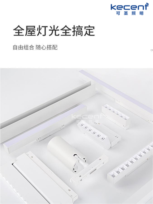 KECENT可圣照明的這款白色磁吸軌道燈,擁有磁吸萬(wàn)向射燈、折疊格柵射燈、條形格柵射燈、條形泛光燈等多類選擇,可滿足不同空間的照明需求。而在本案例中,就采用了條形格柵射燈和條形泛光燈兩類磁吸燈,主要服務(wù)于空間的基礎(chǔ)照明。