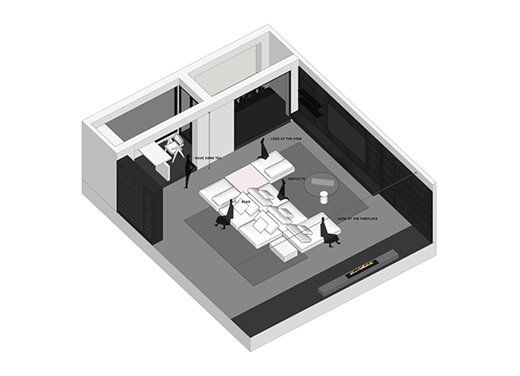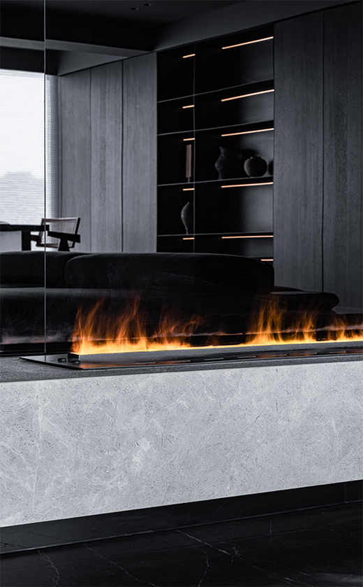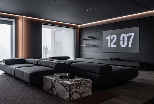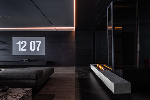 極具體驗(yàn)感的觀影區(qū),將室外的景色引入室內(nèi),既擴(kuò)展延伸了整體空間,又改善了傳統(tǒng)觀影區(qū)壓抑的條件,有了自然的通透感。溫暖的壁爐,柔和的光線讓我們舒緩情緒,靜享安逸時(shí)光。