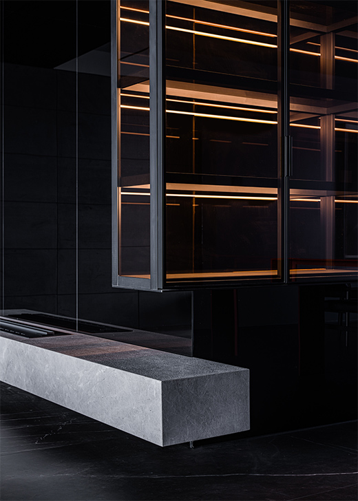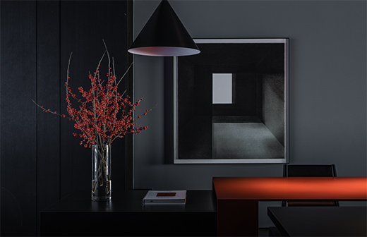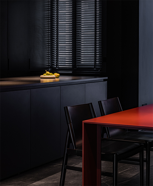 紅色的餐桌以及艷麗的冬青,以熱情的姿態(tài)喚醒沉睡的黑色廚房,設(shè)計(jì)師通過(guò)燈光,突顯材質(zhì)本色。