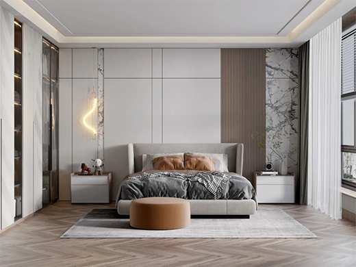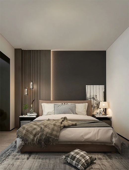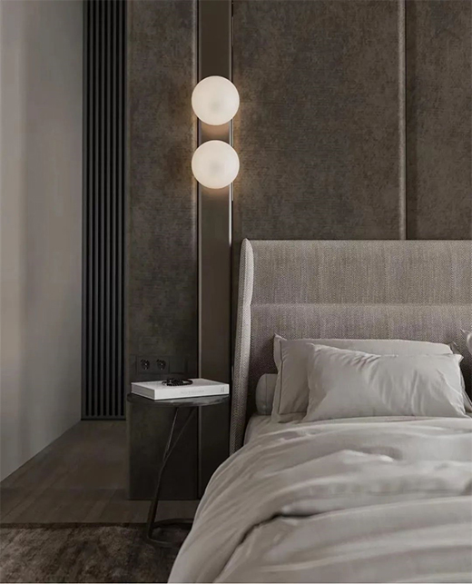 床頭柜上方建議換成柔和的壁燈或者臺燈。臥室的燈色氣溫3000-3500K更加舒適。