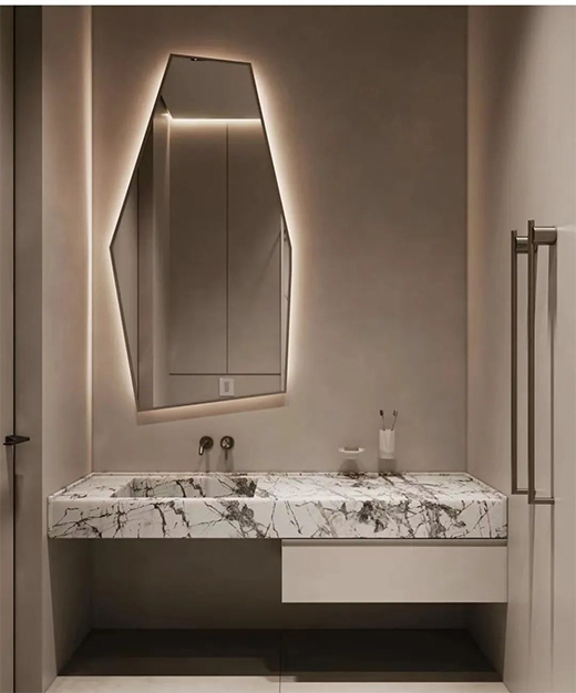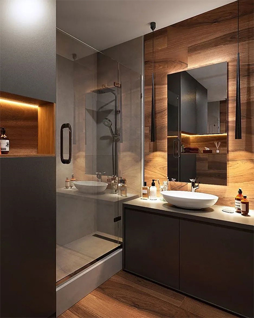 臥室常用的燈具選用鏡前燈或者內(nèi)藏?zé)魩?,需要注意的是淋浴間花灑最好不要裝射燈等,容易被擋住光線甚至反光,洗手臺的燈需要考慮防水性。燈色氣溫不超過3500K更有氣氛烘托效果。