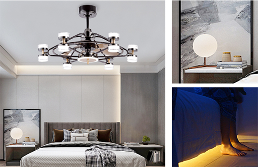 為了方便睡前看手機(jī),可以安裝小臺(tái)燈;為了睡前閱讀,可以使用風(fēng)扇燈的照明;為了起夜方便,可以安裝床下感應(yīng)燈線!