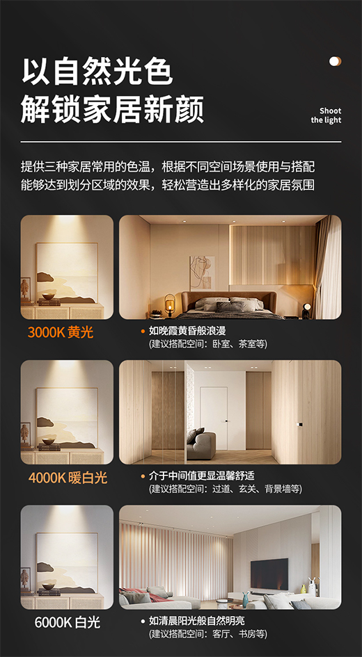 綜合考慮光譜、照度,光分布等維度,融合筒燈、射燈、格柵燈、餐吊燈的優(yōu)勢(shì)于一體。可以與任意家居空間完美契合,滿足用戶多元化的照明場(chǎng)景需求。