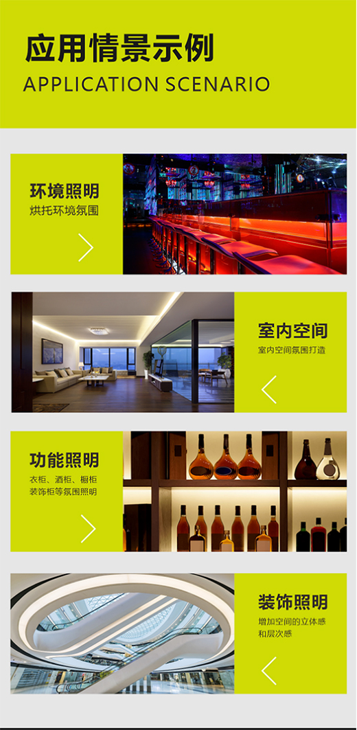 當(dāng)燈帶安裝在天花、墻面、玄關(guān)柜、餐邊柜、或者衣帽間時(shí),不僅起到照明功能,更映照得空間環(huán)境更具層次感,低調(diào)奢華。
