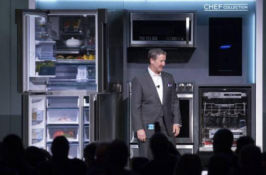 資料圖:在美國拉斯韋加斯,三星美國公司副總裁約翰·赫林頓展示冰箱、洗衣機等新產(chǎn)品。