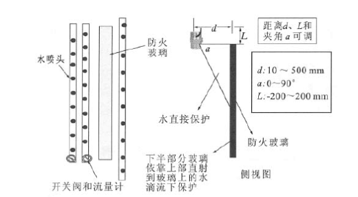 國內(nèi)外的相關實驗表明選擇適當?shù)乃畤娏芟到y(tǒng)保護可以有效延長防火隔熱時間,確保人員疏散。目前此種設計大量應用于大型商業(yè)步行街等性能化設計中,由單片非隔熱型防火玻璃加水噴淋系統(tǒng)保護起到隔熱作用。此類工程做法中最關鍵的是噴淋保護的布水效果,因為實驗表明一旦失去噴淋保護單片防火玻璃將很快失去防煙隔火的作用。