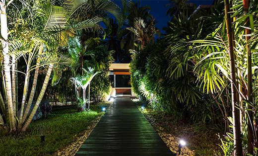 燈具光源的顏色選擇也需要根據對象來確定。就植物照明而言,通常使用白色和綠色。很多人認為使用綠光可以襯托出綠色植物的本色,但大面積的綠光給人一種陰森森的感覺。,中間需要加白光來點綴。如果有其他顏色的植物,比如紅楓、竹林或者其他顏色的假山,最好補充其他顏色的燈光,整體的燈光效果會大大提升。