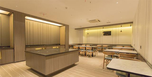 酒店內(nèi)餐廳屬于公共餐飲區(qū)域,對(duì)空間內(nèi)家具的抗菌性能要求甚高,而富美家防火板的抗菌、易清潔的優(yōu)點(diǎn)在餐飲市場(chǎng)得到很大的應(yīng)用。
