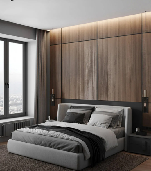 臥室床頭墻也是靠放床鋪的一面墻,通過木飾面來裝飾床頭墻,木質感的元素,可以讓臥室空間更加溫馨舒適,讓睡眠氛圍更加輕松愜意。