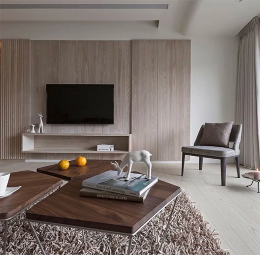 電視墻的用木飾面作為裝飾材質,也可以帶來一個自然舒適而大氣的電視墻視覺感,也可以通過石材+木飾面的結合,讓空間質感更加豐富精致。另外一些電視墻旁邊有房門的情況,也可以通過木飾面+隱形門的設計,保持一個寬大簡潔的電視墻設計。