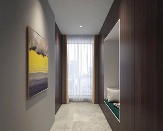 過道作為一個日常活動比較頻繁且狹小的空間,普通的墻面材質容易剮蹭損壞,而木質的飾面板做過道墻面,顯然會更加耐用,且木飾面的溫馨自然質感,也可以讓過道氛圍更加舒適輕松。