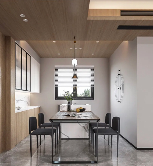 餐廳里的餐桌挨著墻面擺放的話,采用木飾面的話更加耐磨不易損壞,而且木質感與餐桌結合也是非常的溫馨舒適;如果餐桌不是靠墻的布置,餐廳旁的墻面裝成木飾面,也可以房子餐椅挪動時候剮蹭到墻面。