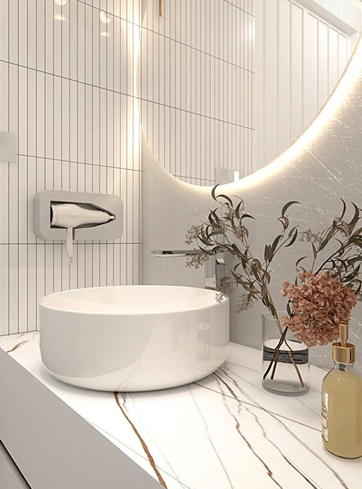 圓形臺(tái)上盆搭配方形巖板臺(tái)面,將“天圓地方“的自然平衡之感帶入衛(wèi)浴間,是顏控福音。
