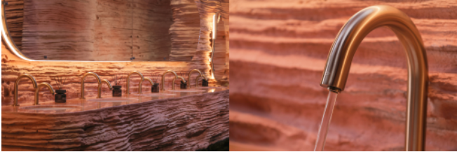 敦煌“凈界”衛(wèi)生間,凝練大漠風(fēng)光與人文符號(hào),雅丹地貌的磅礴氣韻融入空間造型,提取敦煌專屬色彩與美學(xué)肌理,功能之上再造文化地景。雅丹的曲線遇見拉斯凱撒金的輝光,九牧定制敦煌色系龍頭、地漏、紙巾盒,流淌出敦煌的韻律與現(xiàn)代的潔凈,延續(xù)千年不絕的文明星火。
