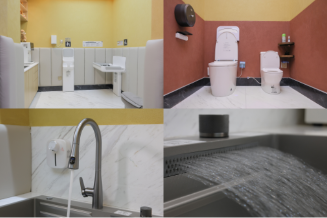 茶歇區(qū)配置九牧多功能水槽,集砧板、置物槽、瀝水板、洗杯器及感應(yīng)抽拉龍頭等一體式設(shè)計(jì),便利沖洗,分區(qū)操作,讓游客暢享舒適。母嬰室配備嬰兒護(hù)理臺(tái)、嬰兒座椅、水槽,第三衛(wèi)生間、無(wú)障礙衛(wèi)生間人性化設(shè)置兒童小便器、兒童馬桶及各類扶手,讓不同群體都能在此從容如廁。