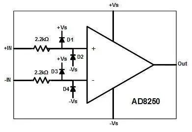 圖 2 顯示了一個具有類似二極管配置的放大器,但在這種情況下,電流受到內(nèi)部 2.2kΩ 串聯(lián)電阻的限制。這與圖 1 所示電路的不同之處不僅在于限制 R 的值,而且還在于 2.2kΩ 可防止電壓高于 +Vs。這是使用 ESD 二極管時必須充分理解以優(yōu)化保護的復(fù)雜性示例。