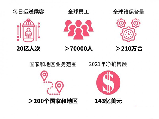 奧的斯的身影幾乎遍布全球大都市,這家成立于1853年歷史悠久的電梯業(yè)巨頭,每天在全球運(yùn)送乘客約20億人次,擁有超過(guò)7萬(wàn)名員工,維保電梯和自動(dòng)扶梯超210萬(wàn)臺(tái),規(guī)模居行業(yè)之首。2021年,奧的斯的業(yè)務(wù)范圍覆蓋全球超過(guò)200個(gè)國(guó)家和地區(qū),凈銷售額達(dá)143億美元。